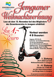 Der Gewerbeverein Jemgum e.V. lädt auch in diesem Jahr zur großen Weihnachtsverlosung ein! Ab dem 15. November sind Lose bei den Mitgliedern des Gewerbevereins in Jemgum erhältlich – für nur 1 Euro pro Los.